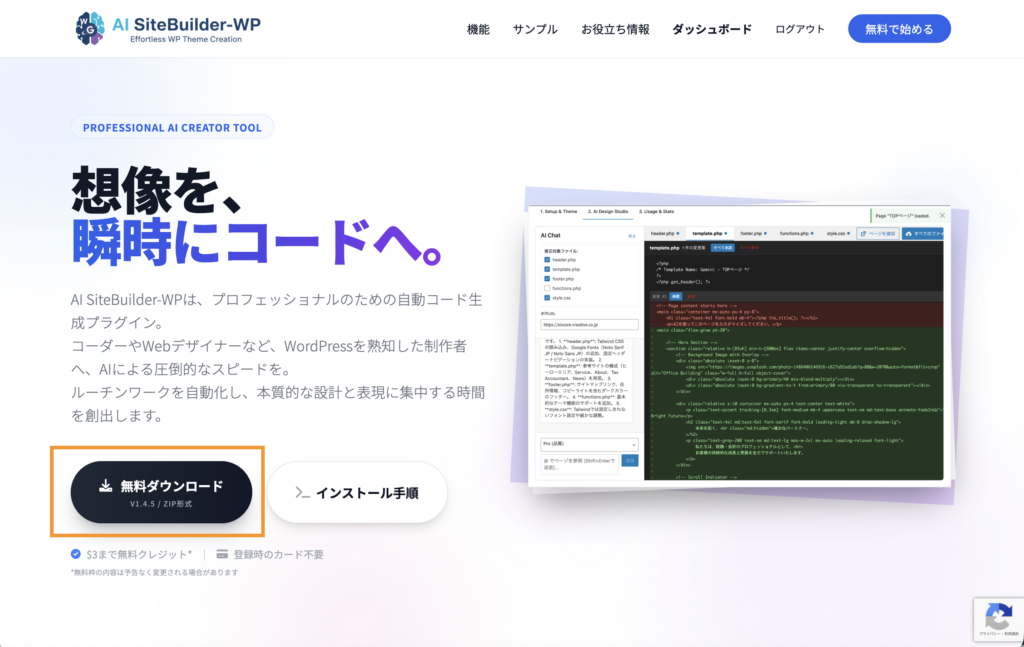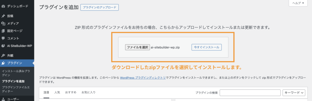 ①AI SiteBuilder-WPプラグインをダウンロードします。