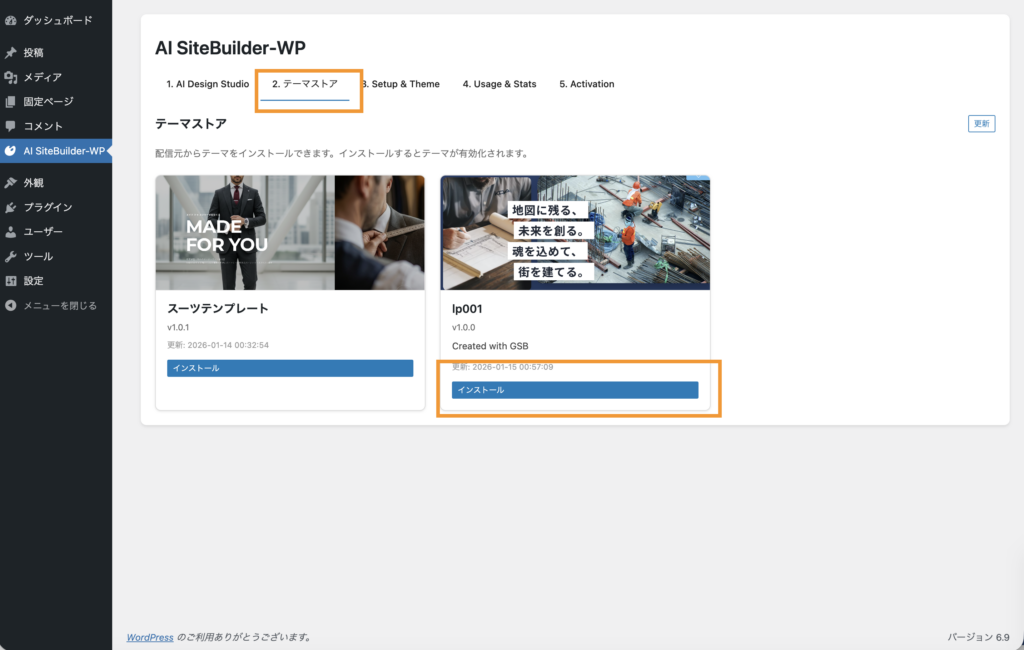 ④「テーマストア」タブをクリックし、希望のテンプレートを選択して「インストール」をクリックします。テーマがダウンロードされ、自動で有効化されます。