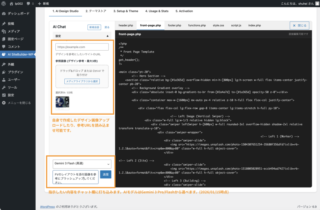 ⑥チャット画面&コードエディター画面が開くので、編集したい箇所をチャットで送信するとAIが自動でコードを改修してくれます。