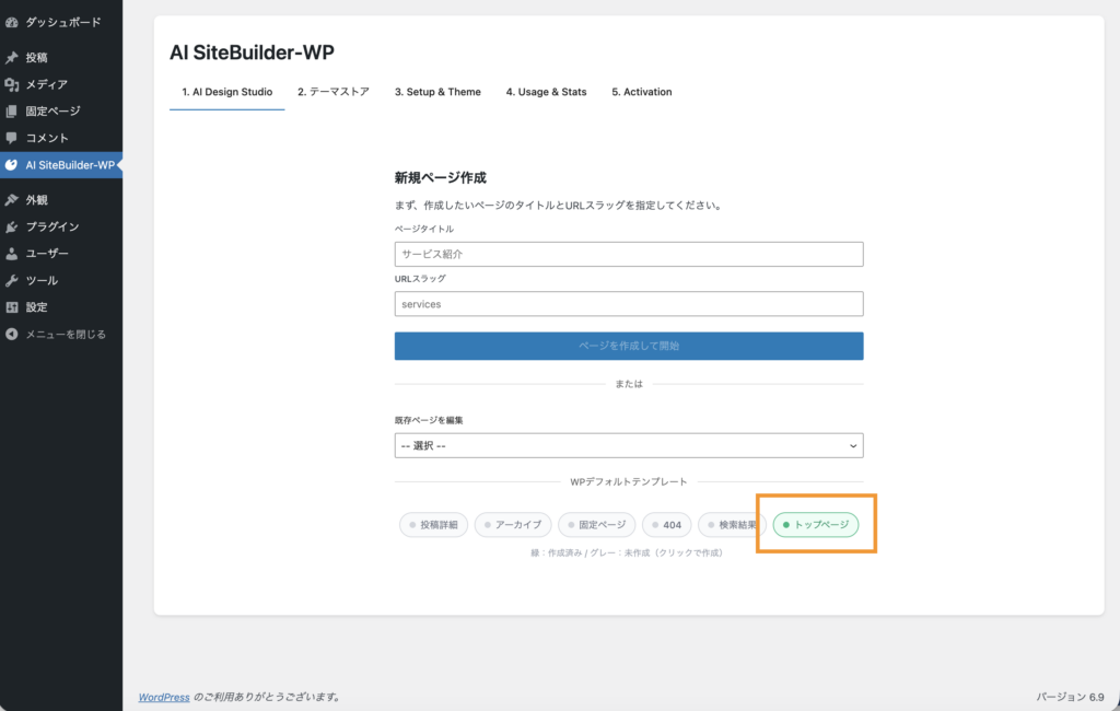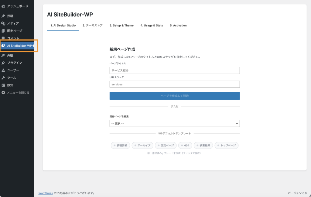 ③ナビメニューに「AI SiteBuilder-WP」が表示されるのでクリックしてプラグインページを表示します。