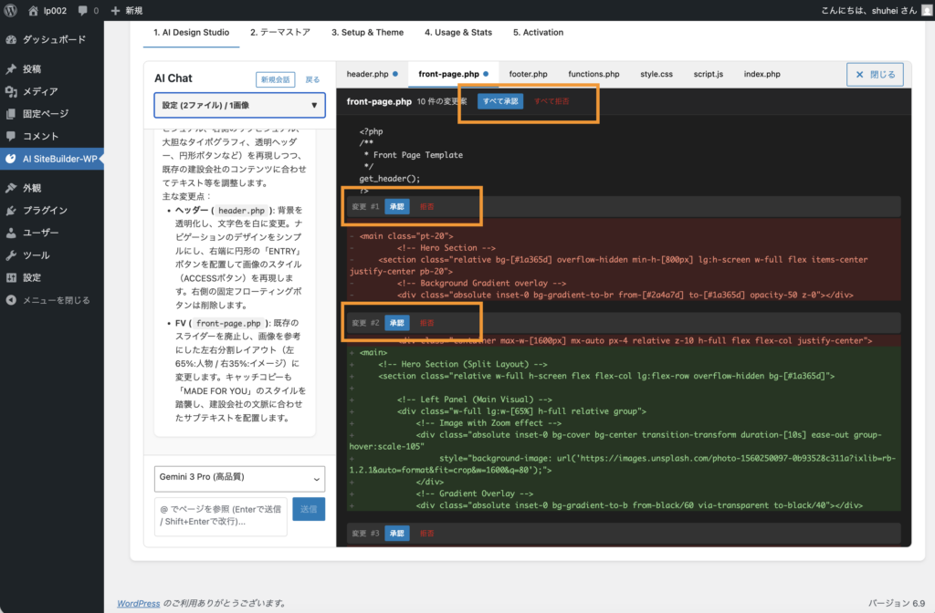 ⑦変更提案が表示されるため、個別に承認、拒否を選択するか、すべて承認、拒否をして修正を反映させてください。変更後の内容は実際のページで確認できるので、問題なければ承認。拒否すると元のコードに戻すことができます。